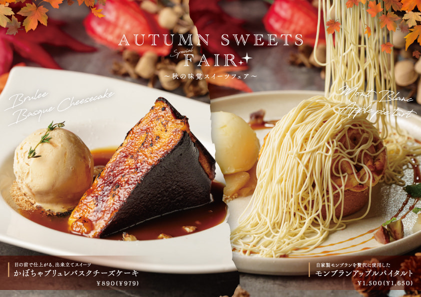 秋を代表する食材・かぼちゃを使用し、表面を香ばしくキャラメリゼした『かぼちゃのブリュレバスクチーズケーキ』そして、甘みの詰まったりんごをふんだんに使い、濃厚なクリームチーズとサクサクのパイ生地を合わせた『モンブランアップルパイ』