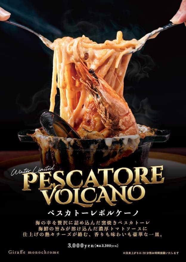 魚介の旨みを贅沢に閉じ込めた「窯焼きペスカトーレボルケーノ」ホタテ、ムール貝、特大エビの濃厚な旨みを凝縮し、仕上げにとろけるチーズソースを目の前でかけて仕上げる、冬にこそ味わいたいご馳走パスタです。